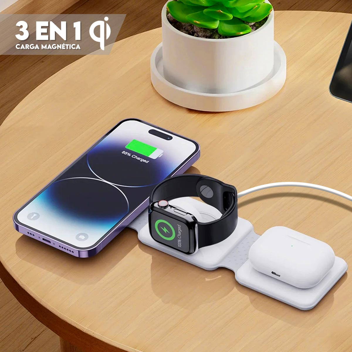 Carga fácilmente tu teléfono, reloj inteligente y tus audífonos inalámbricos sin cables. Un cargador plegable viajero, con una estación de carga rápida para el teléfono, una convencional de uso doble (teléfono o audífonos inalámbricos) y una estación para el reloj inteligente.