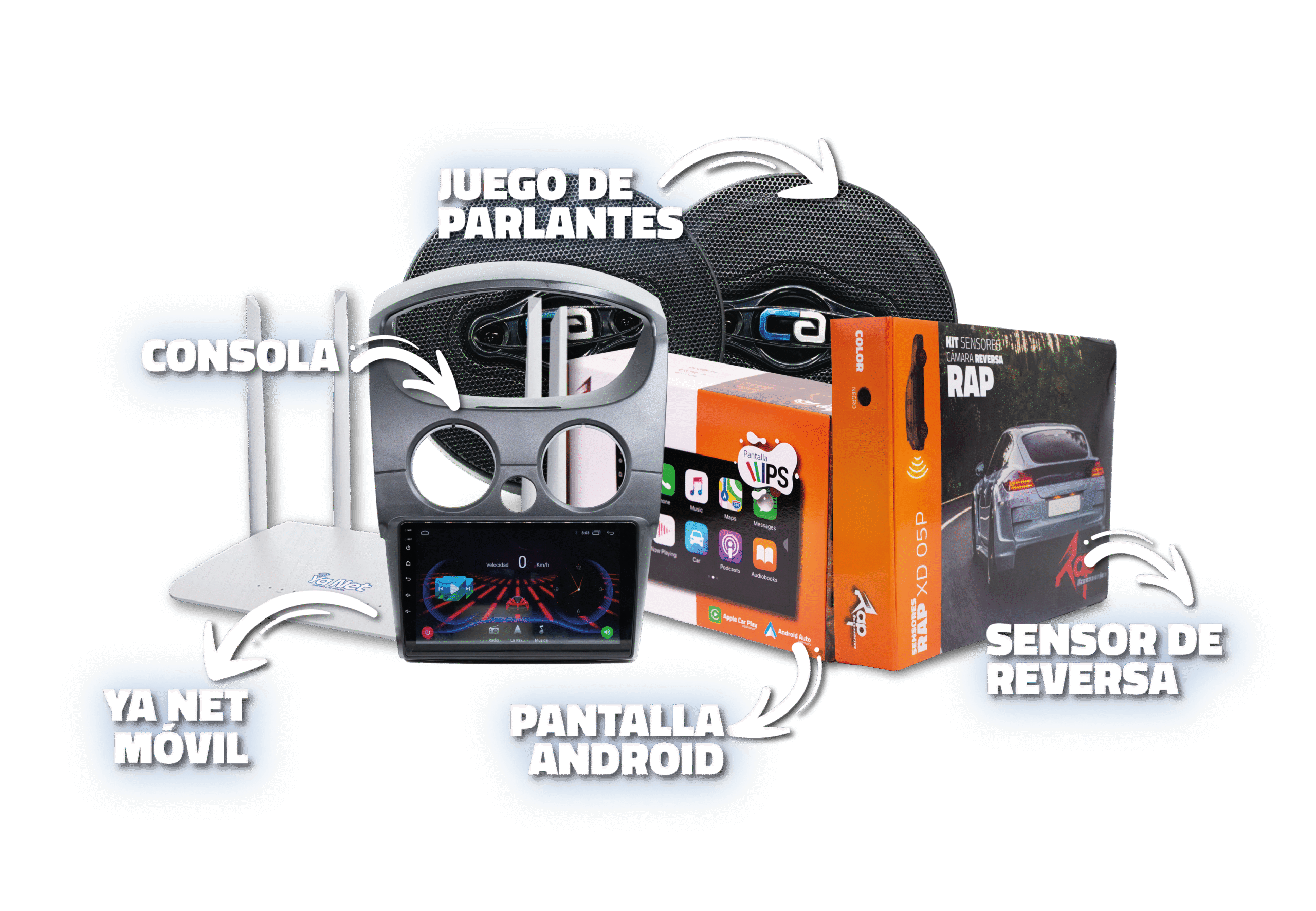 Modem Pocket MIFI de 2,4 ghz para conexión de hasta 4 dispositivos +15 días de internet + Consola Android para vehículo + Pantalla Android 15, CarPlay y Android Auto 9” de pantalla, 2 de RAM, 32 de almacenamiento ROM, reproductor Multimedia, GPS navegador , Control volante, FM Radio, IPS, WIFI, Bluetooth y USB rápido espejo de carga externo enlace + 4 Sensores de 19 mm con cámara con resolución de 420 TVL de reversa, color negro, resistentes al agua, con conector de fácil reemplazo, salida para video y señal auditiva +2 parlantes de 5,25″, 250W, Frecuencia 95-20khz.