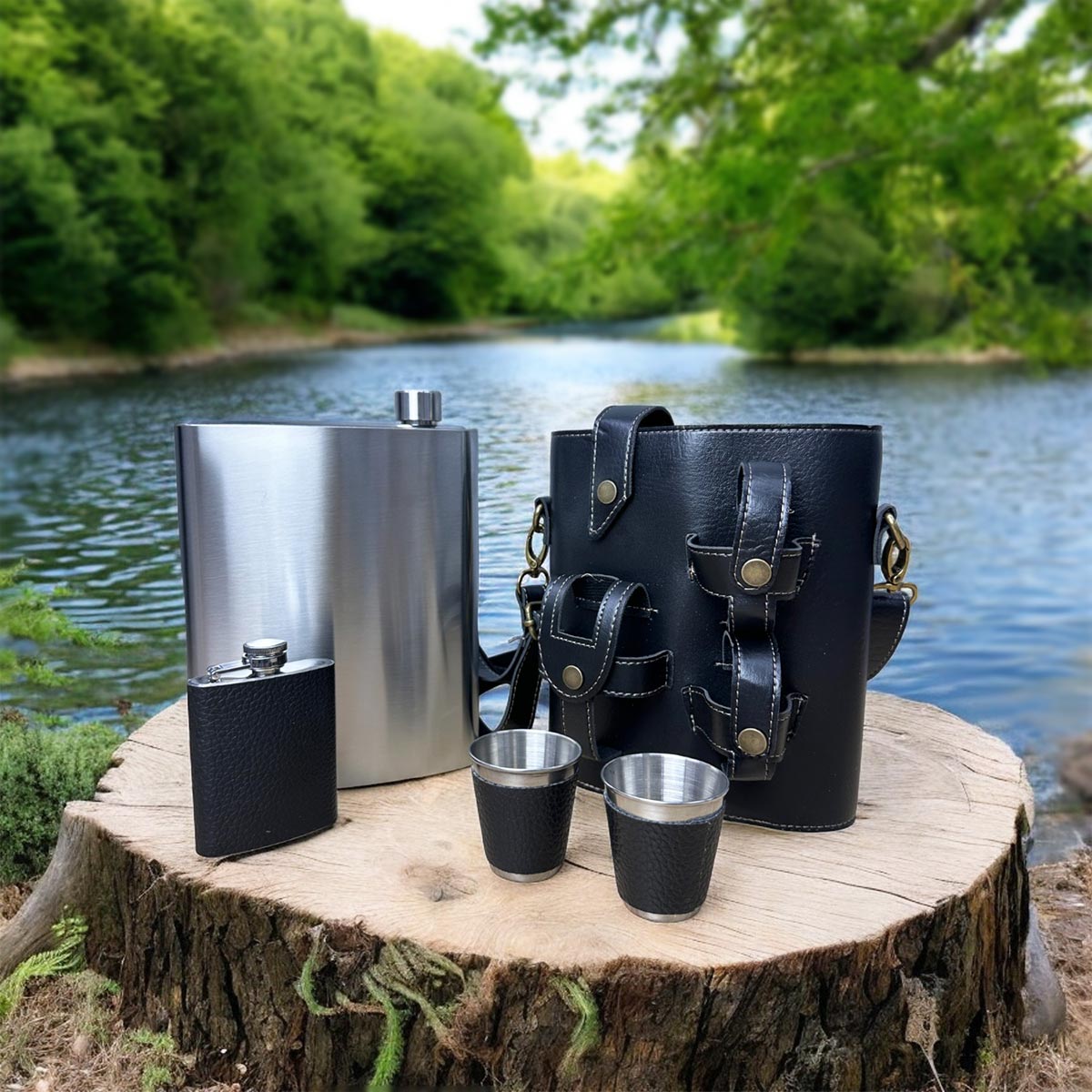 Estas espectaculares whiskeras de 48 y 3 onzas cuentan con un hermoso estuche de cuero el cual puedes llevar como un bolso cruzado. Además, cuenta con 2 copas forradas en cuerina.